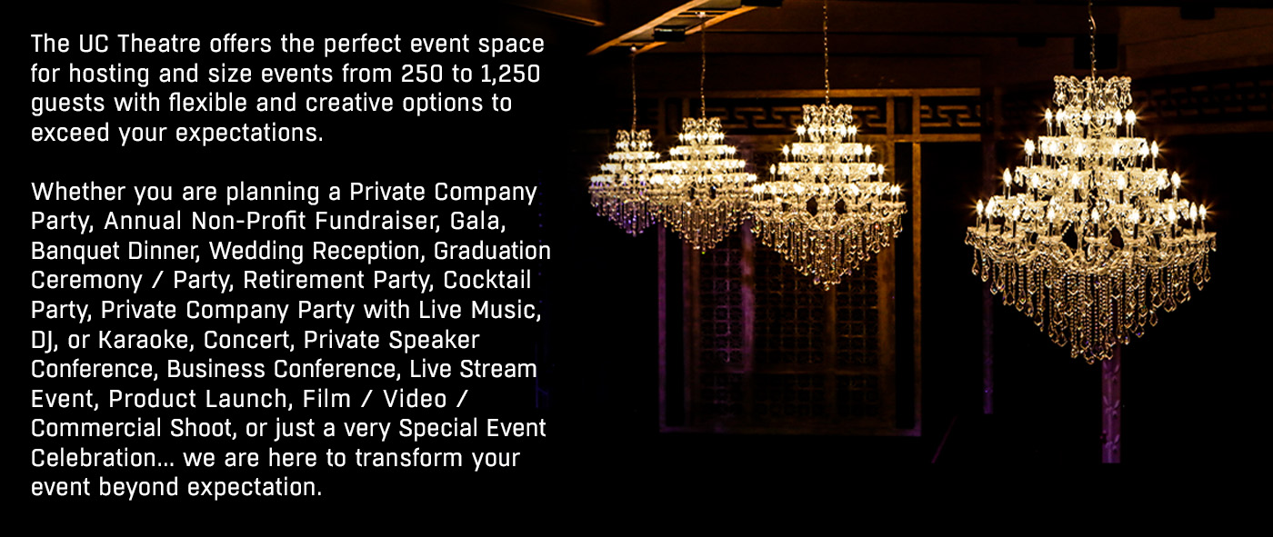 HOLIDAY PARTIES: Plan your next holiday party at The UC Theatre! The UCT offers a uniquely versatile event space that is perfect for gatherings of any size. Host a festive Thanksgiving dinner, get your colleagues into the holiday spirit, or ring in the New Year in an enchanting setting that your guests won't soon forget.