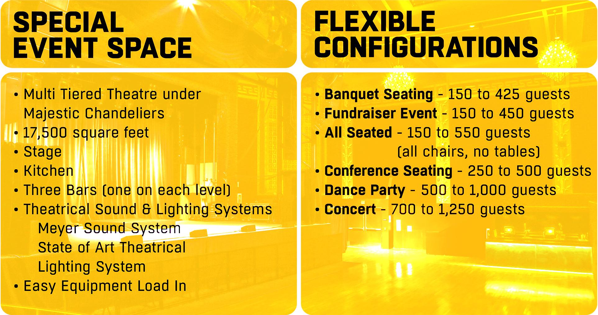 CORPORATE EVENTS: Make corporate cool and inspire your staff with an unforgettable space that can be used to hold a meeting or an all-out party or concert to celebrate your team.
